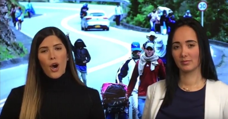 La modelo y animadora Sara Dávila y la periodista Marisela Castillo impulsoras de la campaña #AbrigaAUnVenezolano para los caminantes que cruzan el Páramo de Berlín, en Colombia